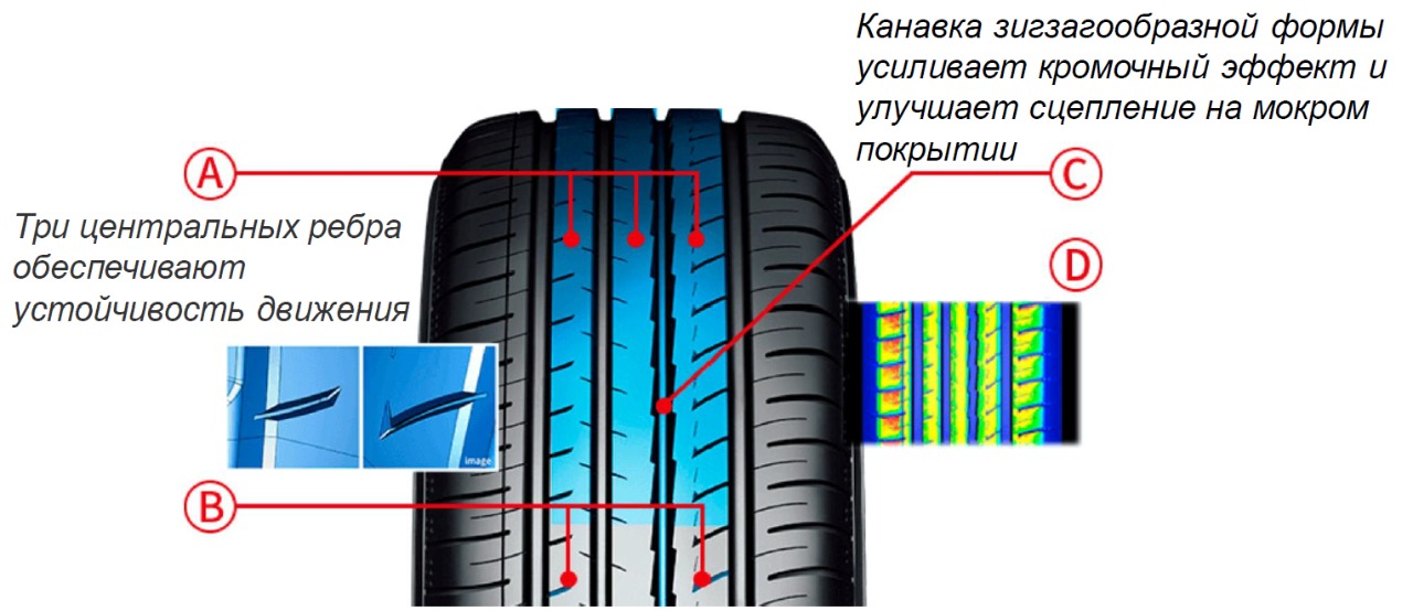 - Топливная эффективность — асимметричный дизайн протектора представлен монолитными блоками различной ширины, снижающими коэффициент сопротивления качению, что позволяет экономить на заправках.